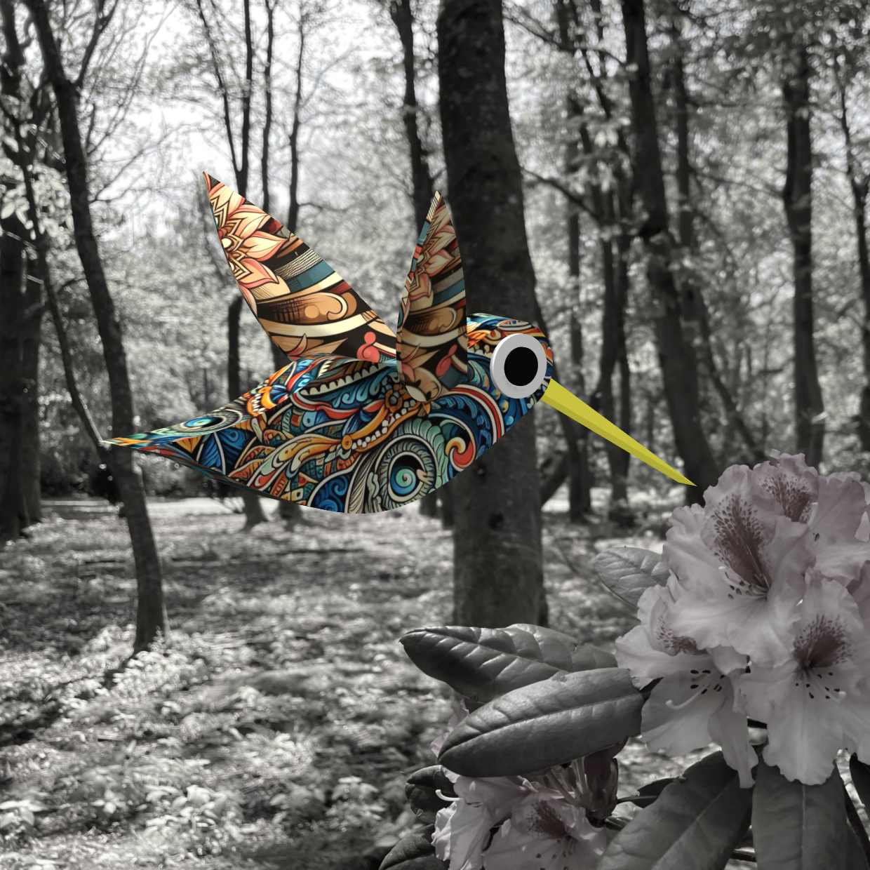 All birds are created with 3D design software and overlayed by hand.